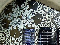 2009年に発売された、SEGAのWii用ゲーム「ソニックと暗黒の騎士」に合わせて製作されたギター。特徴的なグラフィックは、ゲームの世界観を表しているキービジュアルです。ゲーム発売に先駆け、2008年秋に幕張メッセで開催された東京ゲームショウでのイベントライブにて初登場しました。 |