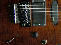 以前はSCHECTER製のピックアップが搭載されていましたが、現在ではSeymour Duncanが搭載されています。また、ブリッジは元々ボディにベタ付けされていましたが、アップリセスが追加されました。 |