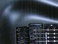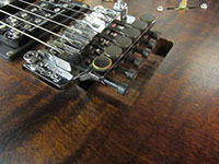 1997年にオーダーメイドで製作されたギター。ブリッジのフロイドローズは、フローティングセッティングではなく、ボディにベタ付けされています。また、フロイドローズのイナーシャブロックには、Performanceのベルブラス製ビッグブロックが取り付けられています。 |