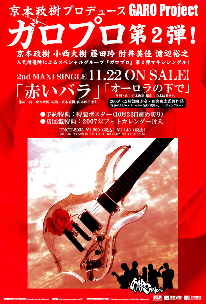 | 皆様、ラクーアイベントが緊急決定したときにお送り致しましたインタビューでの、 京本Pのご発言を覚えてらっしゃいますでしょうか? 京本Pは、当時このようなことをおっしゃっておられました。 「皆様が気になるであろう、ガロプロの今後の展開ということなんですけども、すでに発表されているように牙狼のスペシャル番組が予定されています。ガロプロとして、これにどうやって絡んでいけるか!というのは、これもまたプロデューサーとしての僕にかかってくる部分ですね。 今回はもともと僕が牙狼のために書いたにも関わらず結果として僕が最初歌っていたものを、あとからガロプロでやっているというパターンになりましたけども、次の目標は「純粋たるガロプロのオリジナルソングを特番で出したい!」っていう。 これが一番の目標です。 これが実現するもしないも、全てはガロプロのCDを買ってくださるファンの皆様の応援あってこそなんですけども。。。」 という、このお言葉。 そうなのです! 京本ファンの皆様はすでにご存知の通り、京本Pは「ひたすら有言実行」のお方なのであります! あのときおっしゃっていたお言葉が、今まさに現実となります!! 2曲とも、ガロプロの純粋たるオリジナルソングです!! 「赤いバラ」については、現時点では全く秘密のベールに包まれておりますが、 両A面となる「オーロラの下で」は、 2006年12月放映予定の 「牙狼<GARO>スペシャル〜白夜の魔獣〜」のエンディングテーマとなっております! 皆様!! ガロプロイベントでの、京本P指揮の元、ガロプロファン全員が一体となったあの大合唱レコーディング。・・ よもや忘れたとは言わせませんよっ!笑。 2000人のファンの皆様がひとつとなったあの素晴らしいコーラス、私は今でも昨日のことのように覚えております。 そのときの京本Pのお言葉を、思い出していただきたいのです。。。 「後でみんな楽しいことになるんだから♪」 そうなのです!「オーロラの下で」には、 あの日、あのとき、あの場所で、 皆様が歌ったあのコーラスが収録されているのであります!! これは、ガロプロを応援してくださっているファンの皆様への、 京本Pからの最高の贈り物なのです! と、とにかく!! 現時点でお伝え出来るのはここまででございます。 続報を、 続報を、震えてお待ち下さい!!!!!!!! 赤いバラの試聴はトライスクルホームページよりどうぞ!!! |