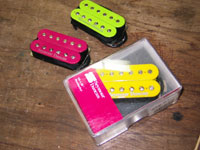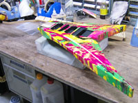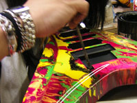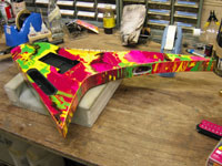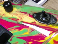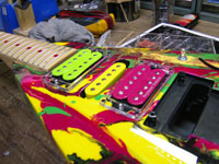 | これがNEWギタ〜のボディとネック!見るものを圧倒するカラフルなこの模様は通称:マ〜ブルと呼ばれているものだ。 |
