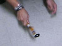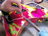| JTMがハンマ〜でキャッツ・アイ・ジャックプレ〜トを叩いて伸ばしている。 |