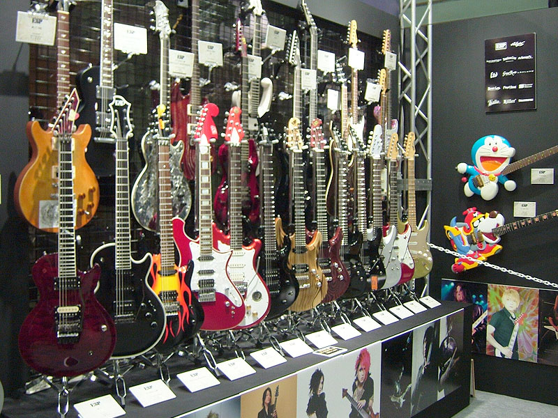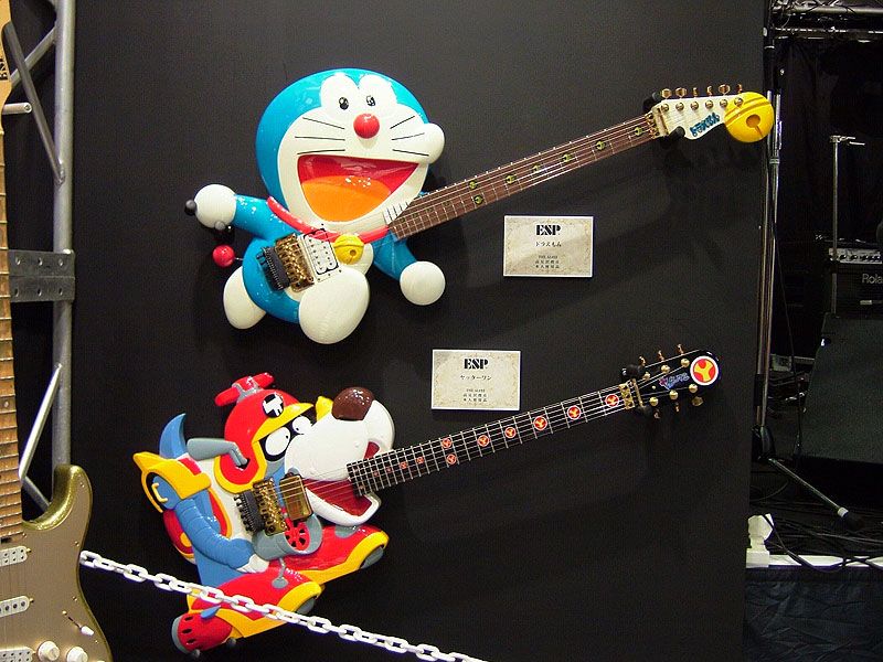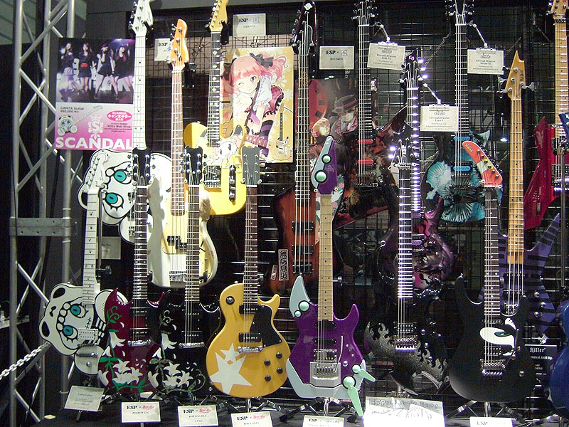 ここ最近はコラボレーションにも力を入れています。ゲームやアニメ、マンガなど多岐に渡っています。右からSCANDALのマスコットキャラクター"Canta"、OVERDRIVEさんのゲーム"キラ☆キラ"と"DEARDROPS"、マクロス7から"熱気バサラギター"、アメコミの"Eternal Descent"、コミックブレイドで連載中の"とらねこフォークロア"、SEGAを代表するゲーム"SONIC THE HEDGEHOG"。 |