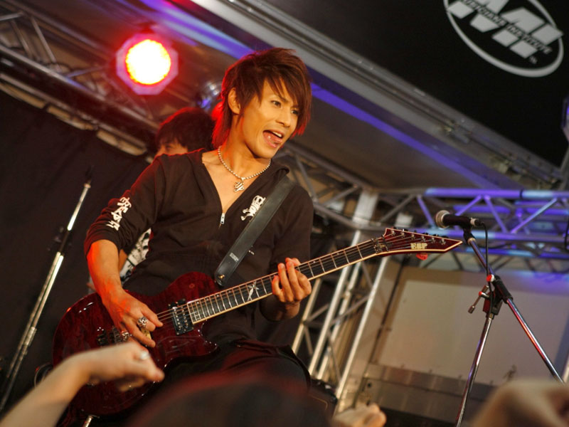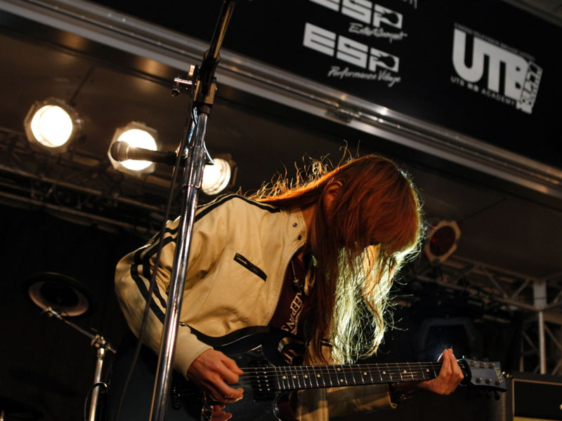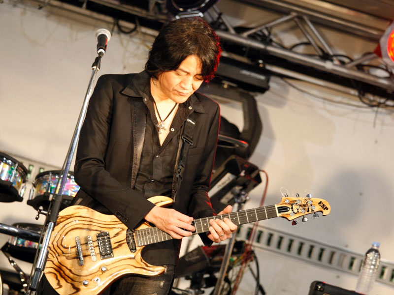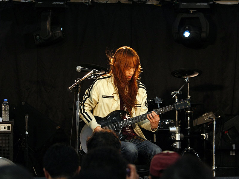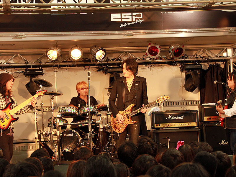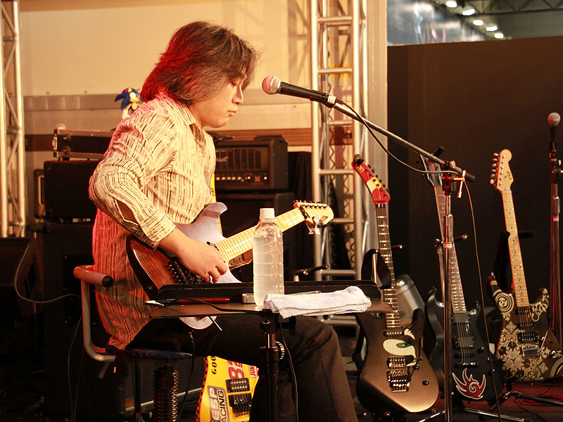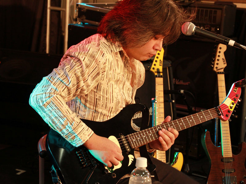 ESPカスタムメイドギターを操り、自身のバンドALHAMBRAの楽曲をプレイ。そのテクニックに皆釘付け。 |