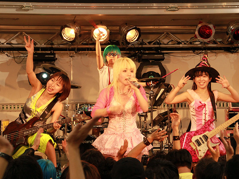 弦楽器3人(L to R : Shinno、華凜、Kyrie)によるデモンストレーション。途中、Vo.:団長とDs:Kも乱入し、終始和やかに進行しました。 |