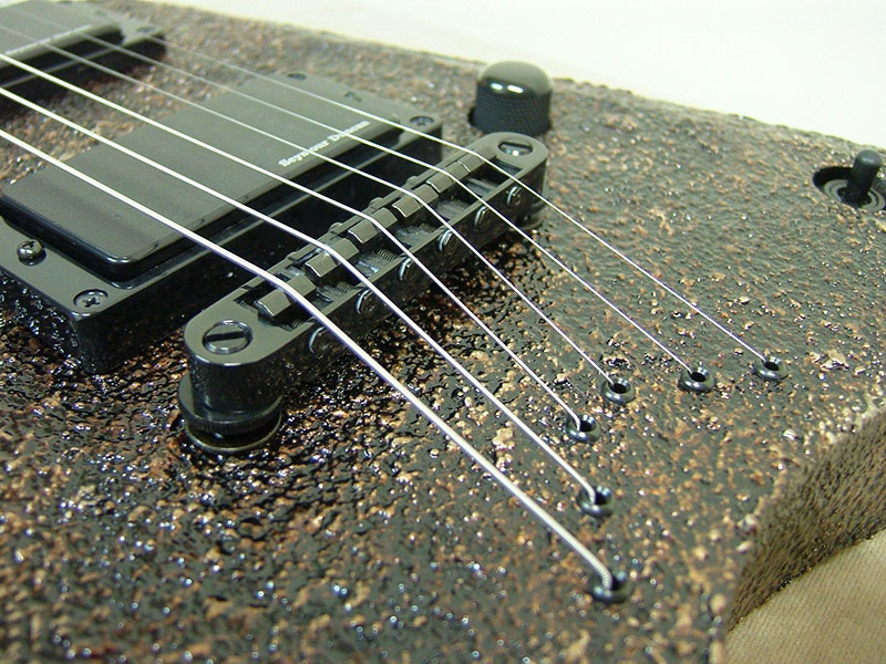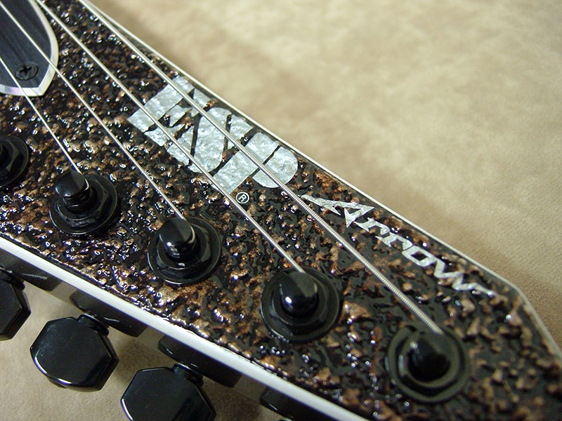 鋭角なボディシェイプを持つESP-ARROWは、まさにメタルギアといってよいでしょう。ピックアップにはセイモアダンカンのアクティブハムバッカーAHB-1 Blackoutsを搭載し、そのルックスに負けないサウンドを約束します。