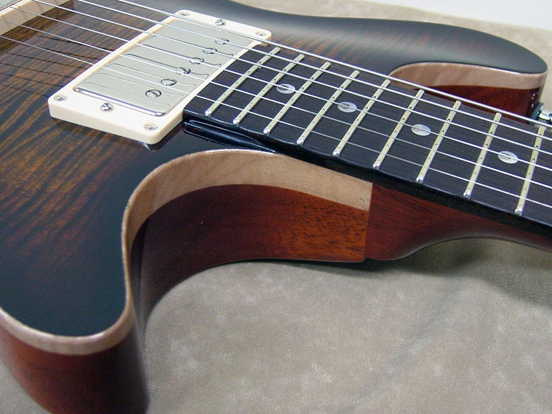 トップ材に希少価値の高いフレイムメイプルを贅沢に使用しています。ボディのエッジ部分にはカラーを付けないナチュラルバインディングになっていますので、トップ材の厚みを目で確認することが可能です。