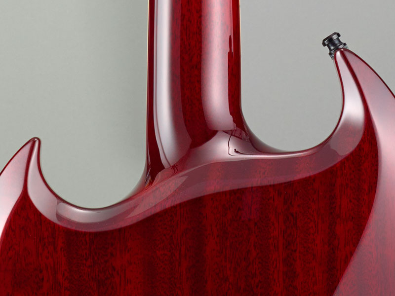 ブリッジには、弦交換時にスタッドから不意に外れるのを防ぎ、弦振動をロスなく伝えるトーンプロス®を、ペグには弦交換が容易に行える、ロック式ペグのGOTOH MG-Tをそれぞれ採用しています。ボディ材はマホガニー、ネック材はハードメイプル3ピース材(ブラック、スノーホワイト)またはホンデュラスマホガニー(チェリー)がセットネック方式でジョイントされています。