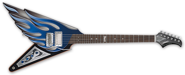 FLYING NIGHTHAWK LFはFLYING NIGHTHAWKの容姿をほぼ継承しつつ指板にローズウッドを使用し、ボディーのブルーファイヤー/羽根の部分はフラットトップで成形されています。