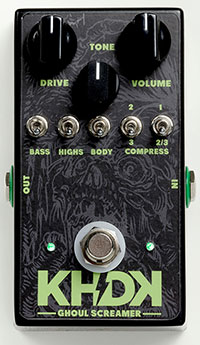 KHDKエレクトロニクスは、メタリカのギタリストであるカーク・ハメットと、旧知の間柄で業界のベテランデヴィッド・カロンで共同創設された新進気鋭のエフェクターブランドで、お互いの頭文字(Kirk Hammett David Karon)を取って命名されています。このGhoul Screamerは、非常に多彩なサウンドクリエイトが可能で、5つのミニスイッチによりオーソドックスで温かみのあるオーバードライブサウンドから現代的でクールな攻撃的サウンドまで幅広く対応しています。
