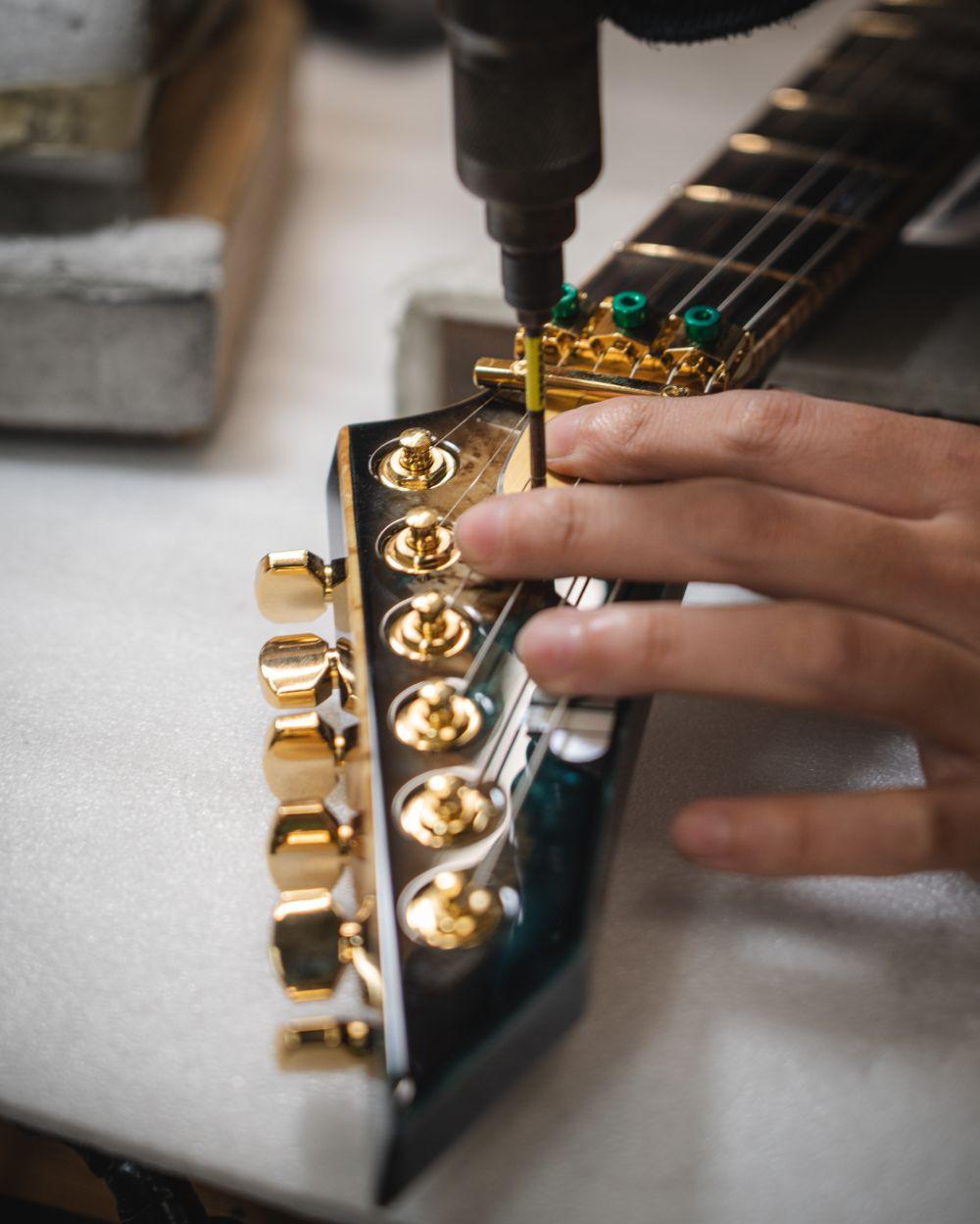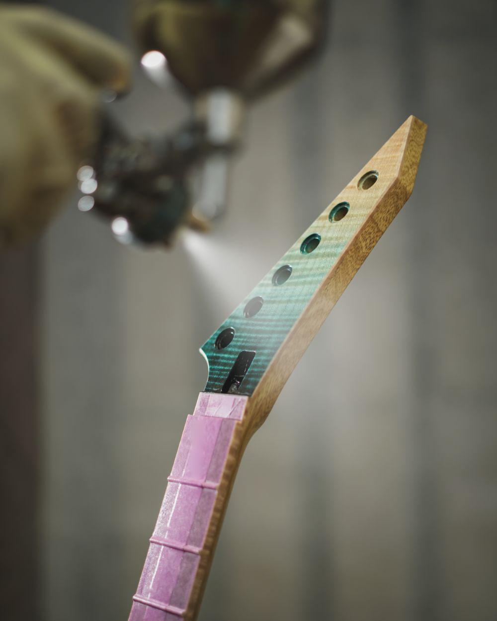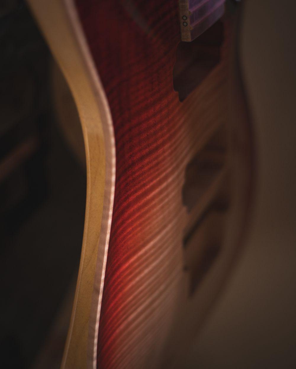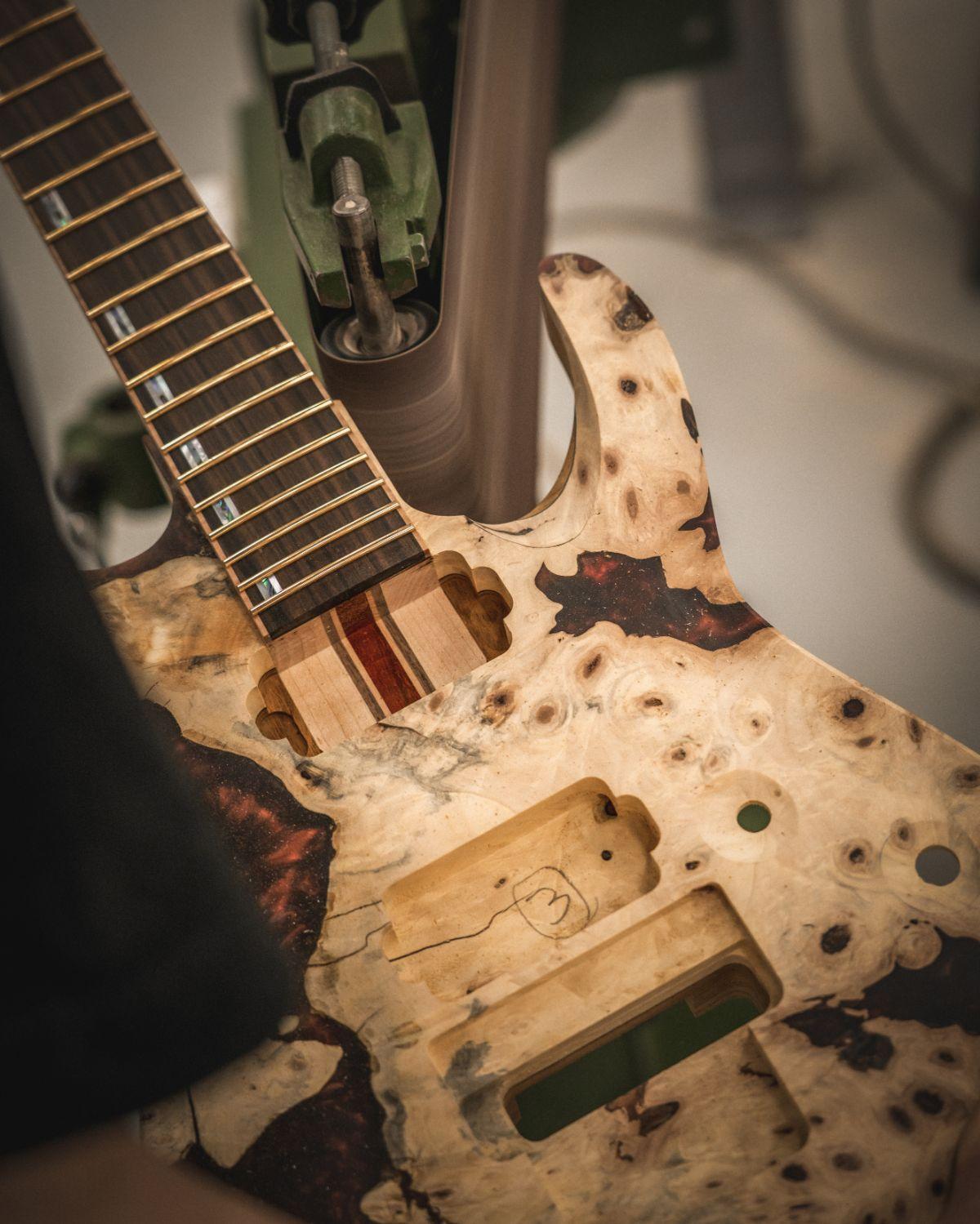 仕様も特別仕様ならではで、ボディバックにはローステッド・アッシュの1ピースを贅沢に、トップには個性的でワイルドなレジンで補填したバックアイ・バールをラミネート。ネックにはハードメイプル、ウォルナット、パドゥクをラミネートした7ピース材で、ボディにはセットネック方式でボディにジョイントされています。指板は縞模様が美しいマカッサル・エボニーで、アクセントにフレイムメイプルのバインディングが巻かれています。フレットにはJESCARのゴールドカラーのEVOが採用されています。ポジションマークは低音弦側に寄った白蝶貝とアバロン貝で構成されたダブルストライプ、サイドには蓄光素材のLuminlayが入れられています。