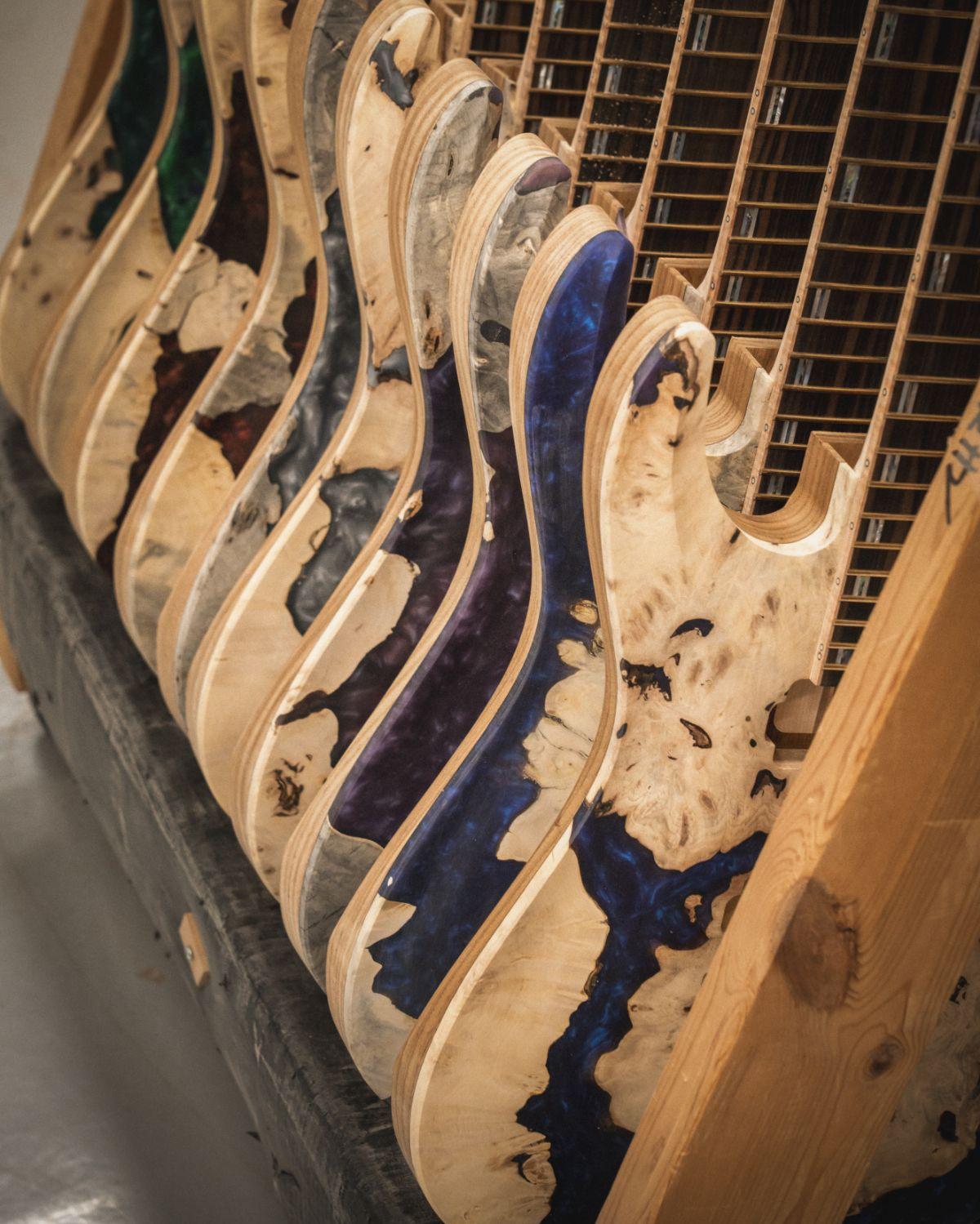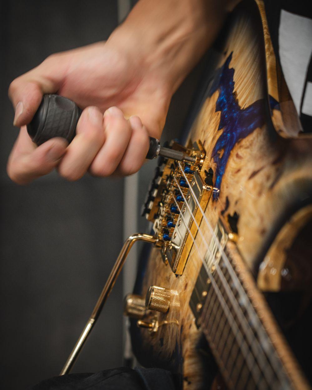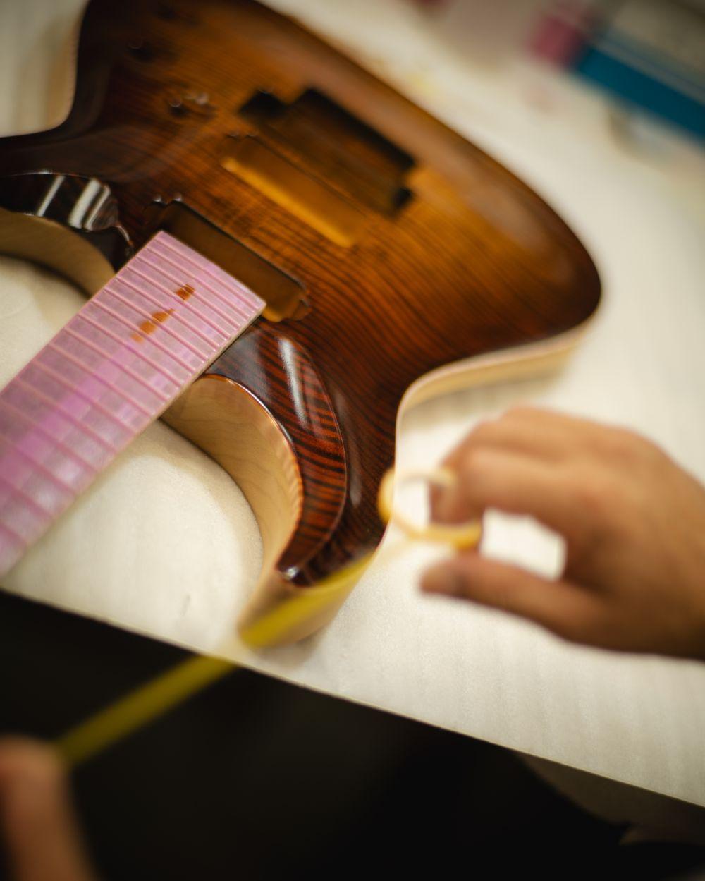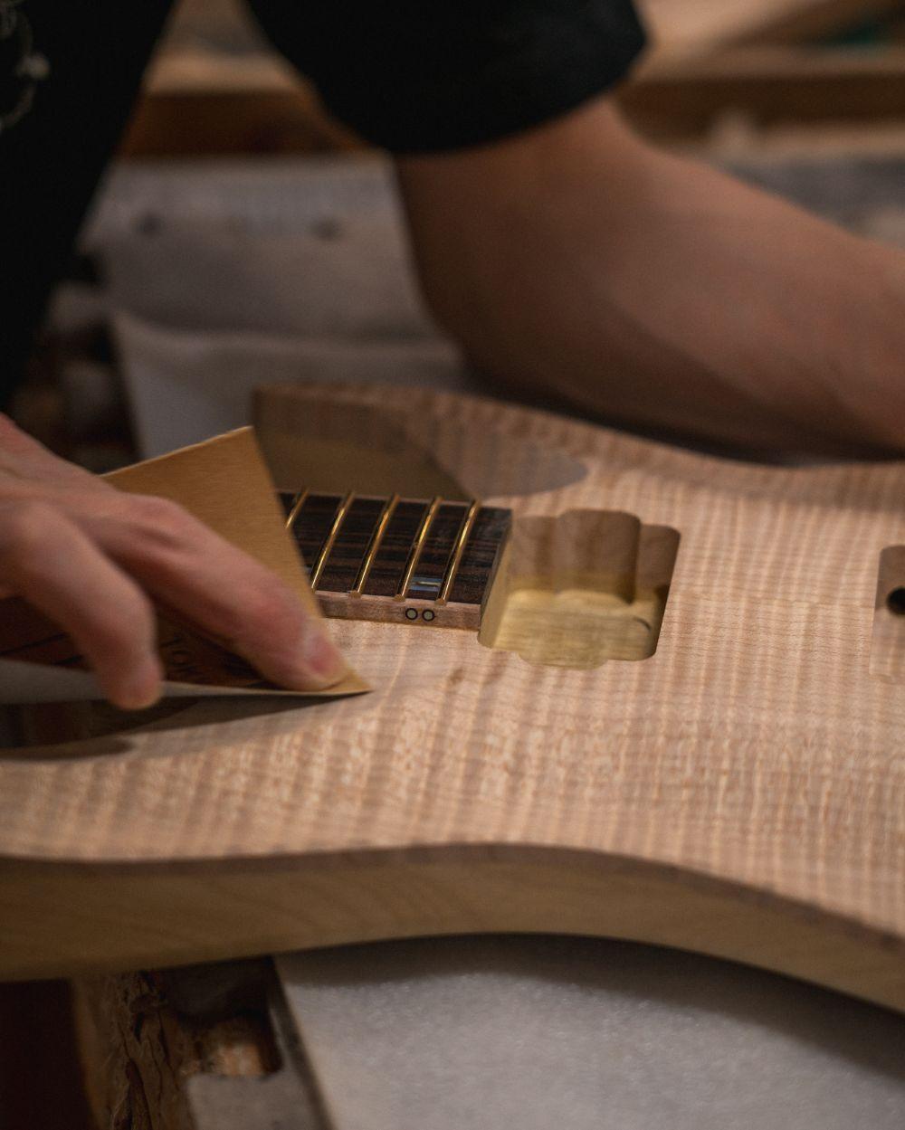 仕様も特別仕様ならではで、ボディバックにはローステッド・アッシュの1ピースを贅沢に、トップには個性的でワイルドなレジンで補填したバックアイ・バールをラミネート。ネックにはハードメイプル、ウォルナット、パドゥクをラミネートした7ピース材で、ボディにはセットネック方式でボディにジョイントされています。指板は縞模様が美しいマカッサル・エボニーで、アクセントにフレイムメイプルのバインディングが巻かれています。フレットにはJESCARのゴールドカラーのEVOが採用されています。ポジションマークは低音弦側に寄った白蝶貝とアバロン貝で構成されたダブルストライプ、サイドには蓄光素材のLuminlayが入れられています。