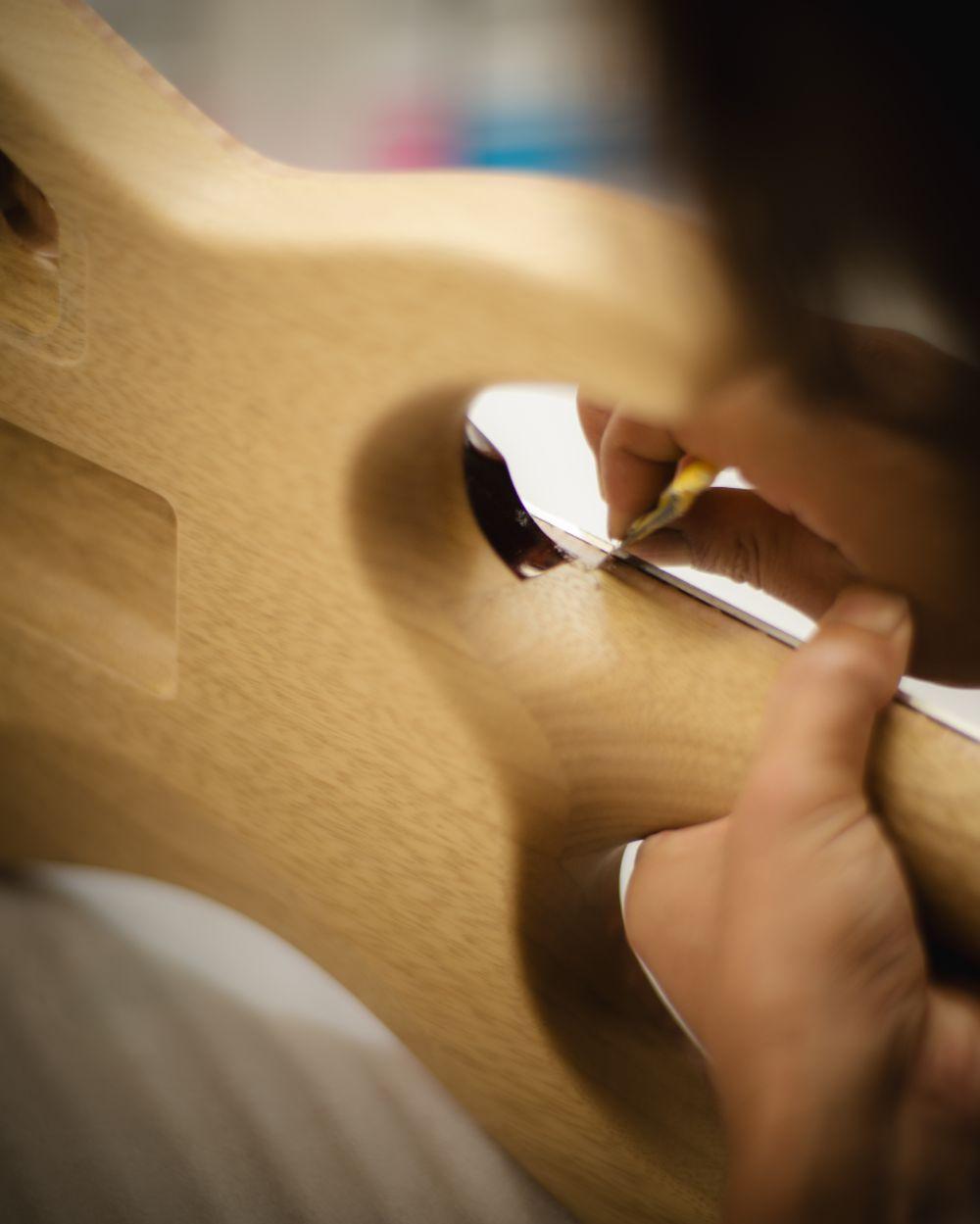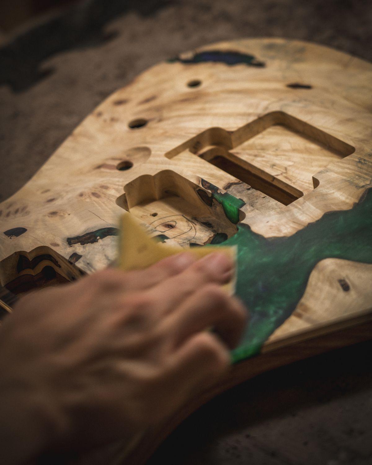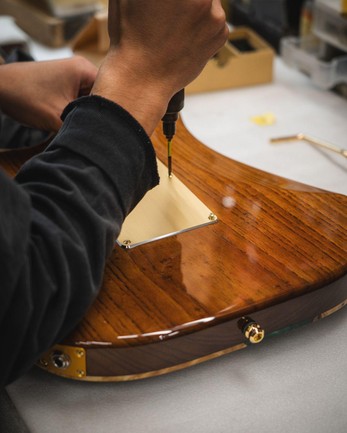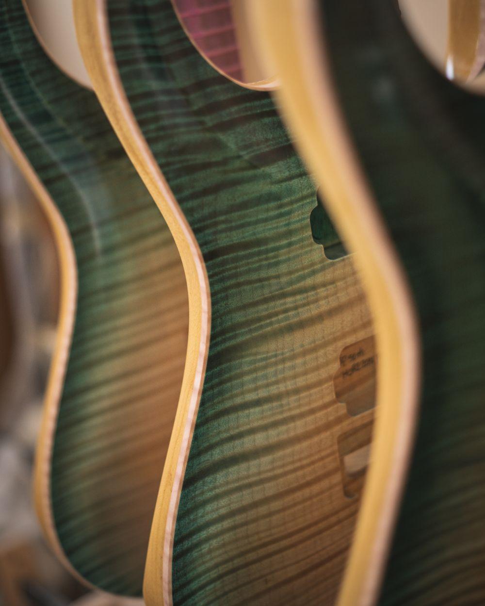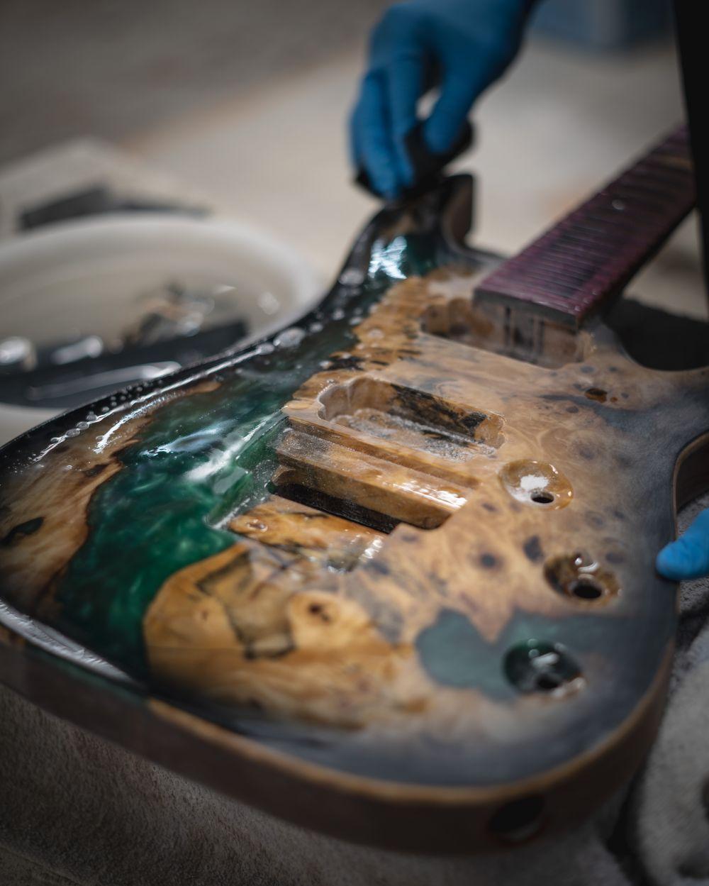 仕様も特別仕様ならではで、ボディバックにはローステッド・アッシュの1ピースを贅沢に、トップには個性的でワイルドなレジンで補填したバックアイ・バールをラミネート。ネックにはハードメイプル、ウォルナット、パドゥクをラミネートした7ピース材で、ボディにはセットネック方式でボディにジョイントされています。指板は縞模様が美しいマカッサル・エボニーで、アクセントにフレイムメイプルのバインディングが巻かれています。フレットにはJESCARのゴールドカラーのEVOが採用されています。ポジションマークは低音弦側に寄った白蝶貝とアバロン貝で構成されたダブルストライプ、サイドには蓄光素材のLuminlayが入れられています。