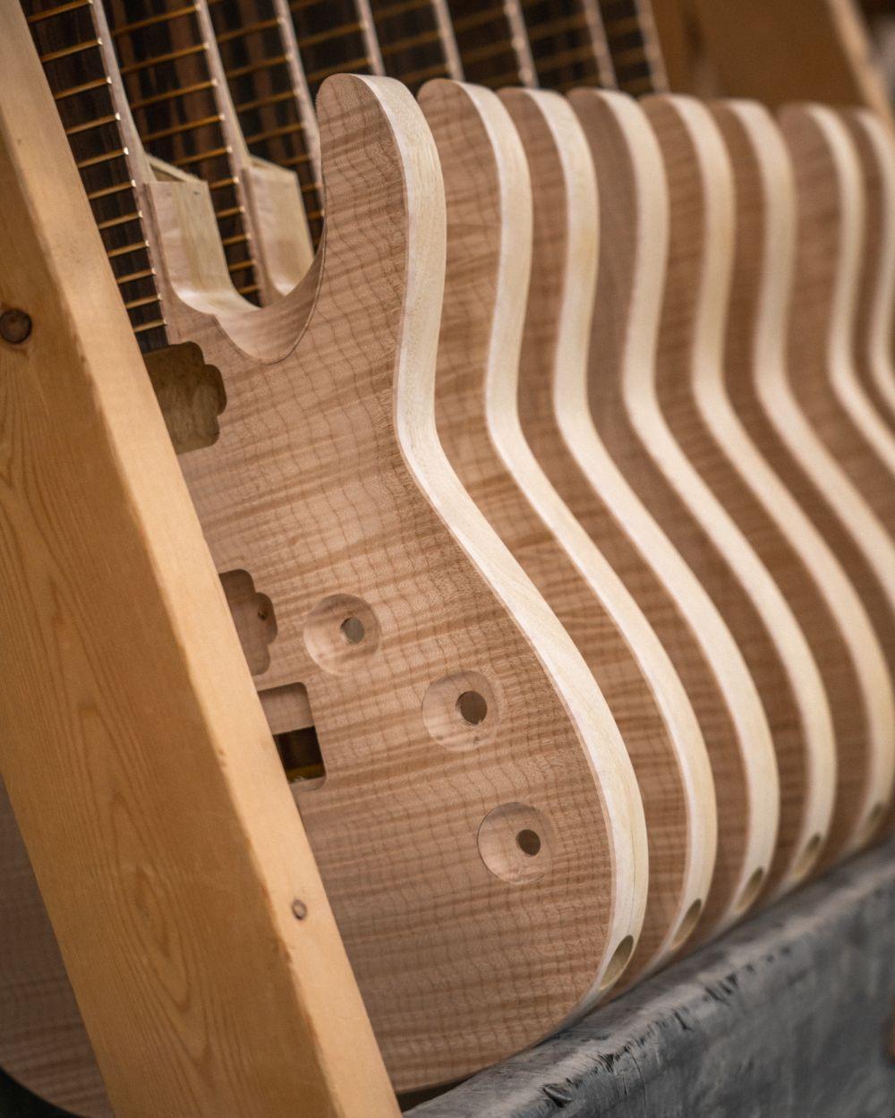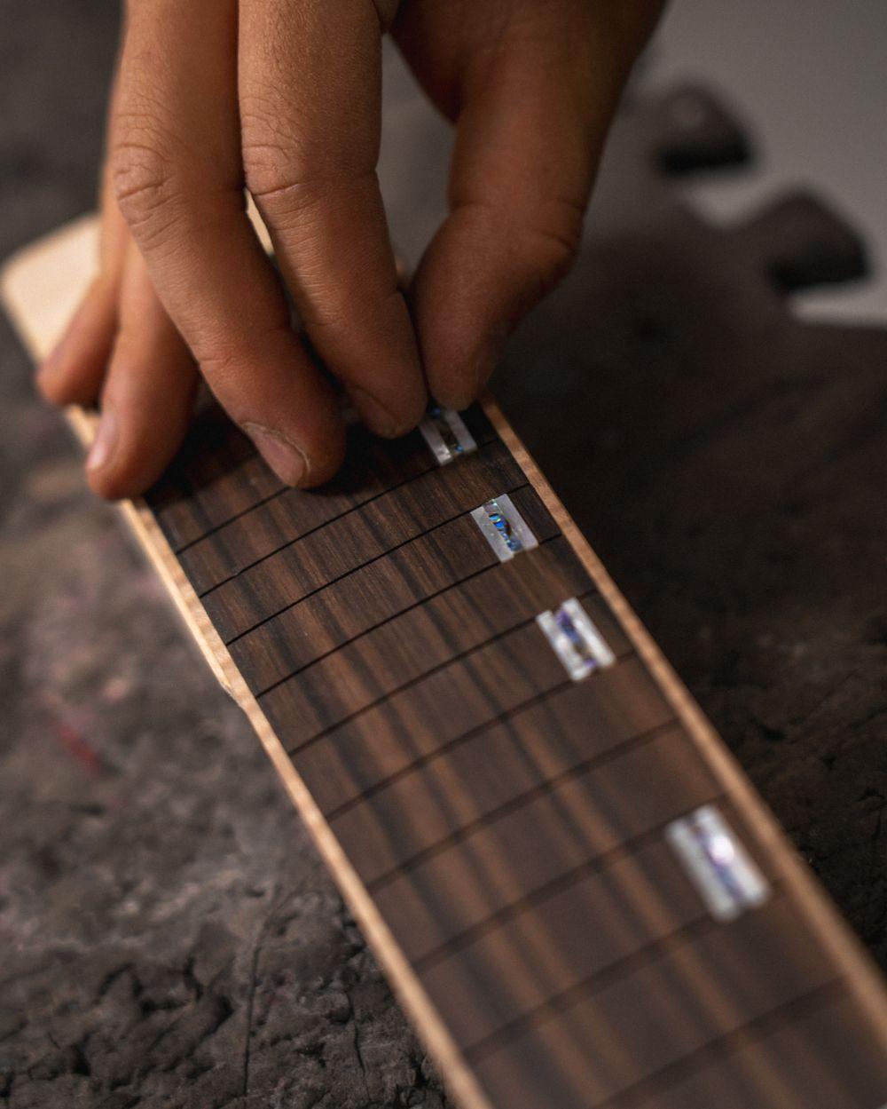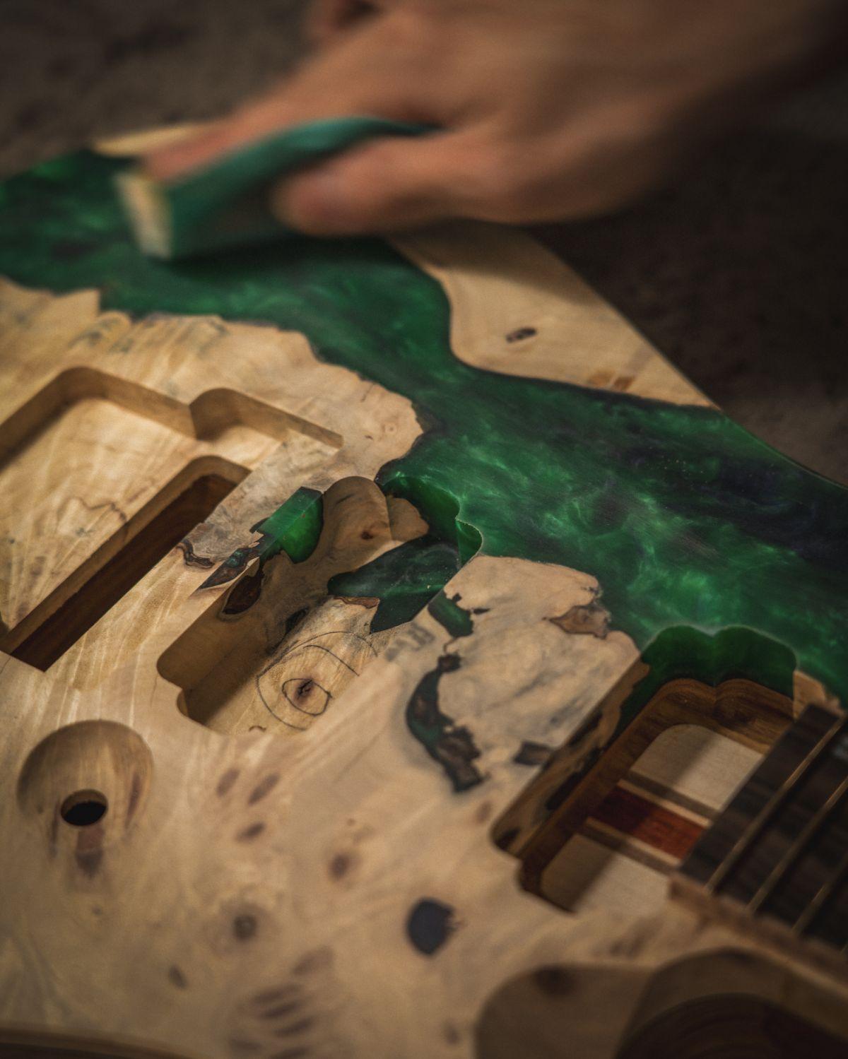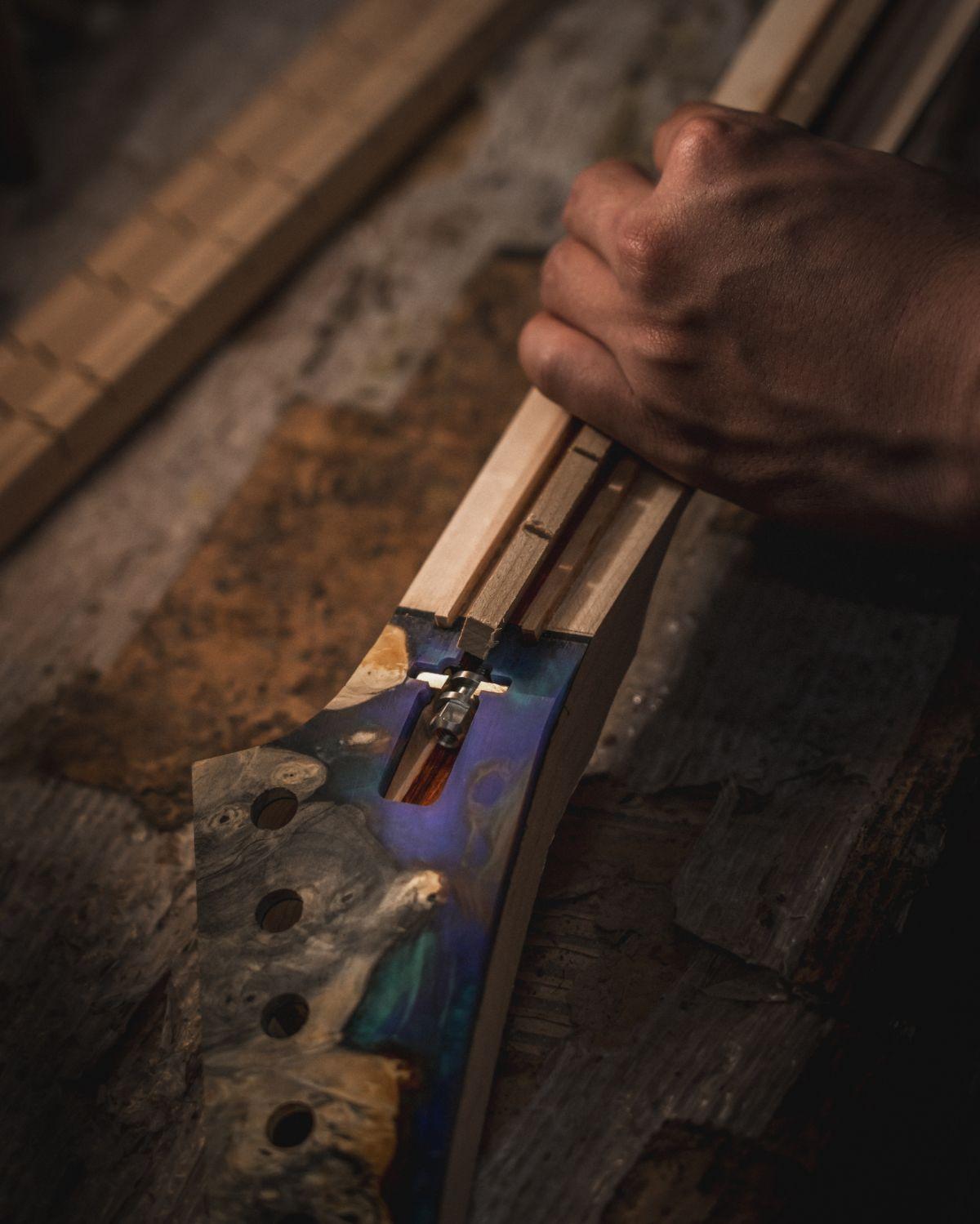 仕様も特別仕様ならではで、ボディバックにはローステッド・アッシュの1ピースを贅沢に、トップには個性的でワイルドなレジンで補填したバックアイ・バールをラミネート。ネックにはハードメイプル、ウォルナット、パドゥクをラミネートした7ピース材で、ボディにはセットネック方式でボディにジョイントされています。指板は縞模様が美しいマカッサル・エボニーで、アクセントにフレイムメイプルのバインディングが巻かれています。フレットにはJESCARのゴールドカラーのEVOが採用されています。ポジションマークは低音弦側に寄った白蝶貝とアバロン貝で構成されたダブルストライプ、サイドには蓄光素材のLuminlayが入れられています。