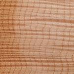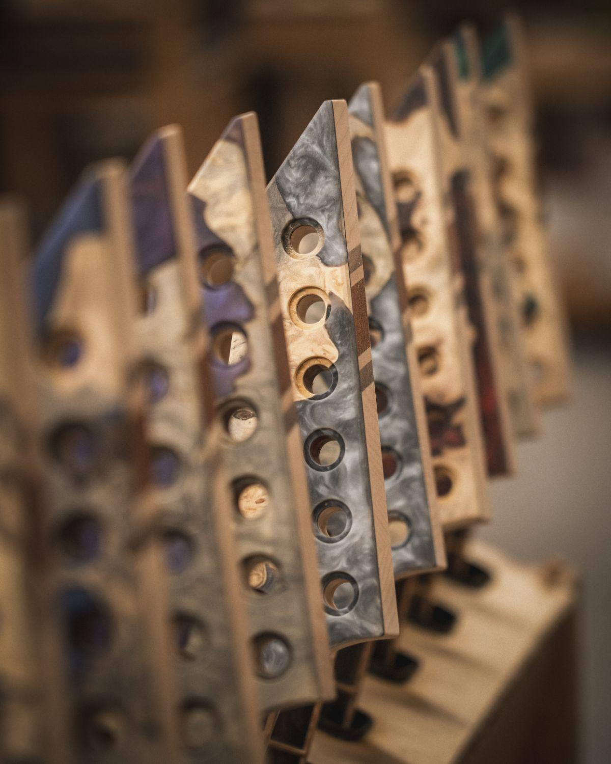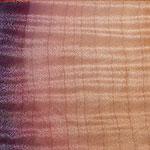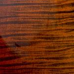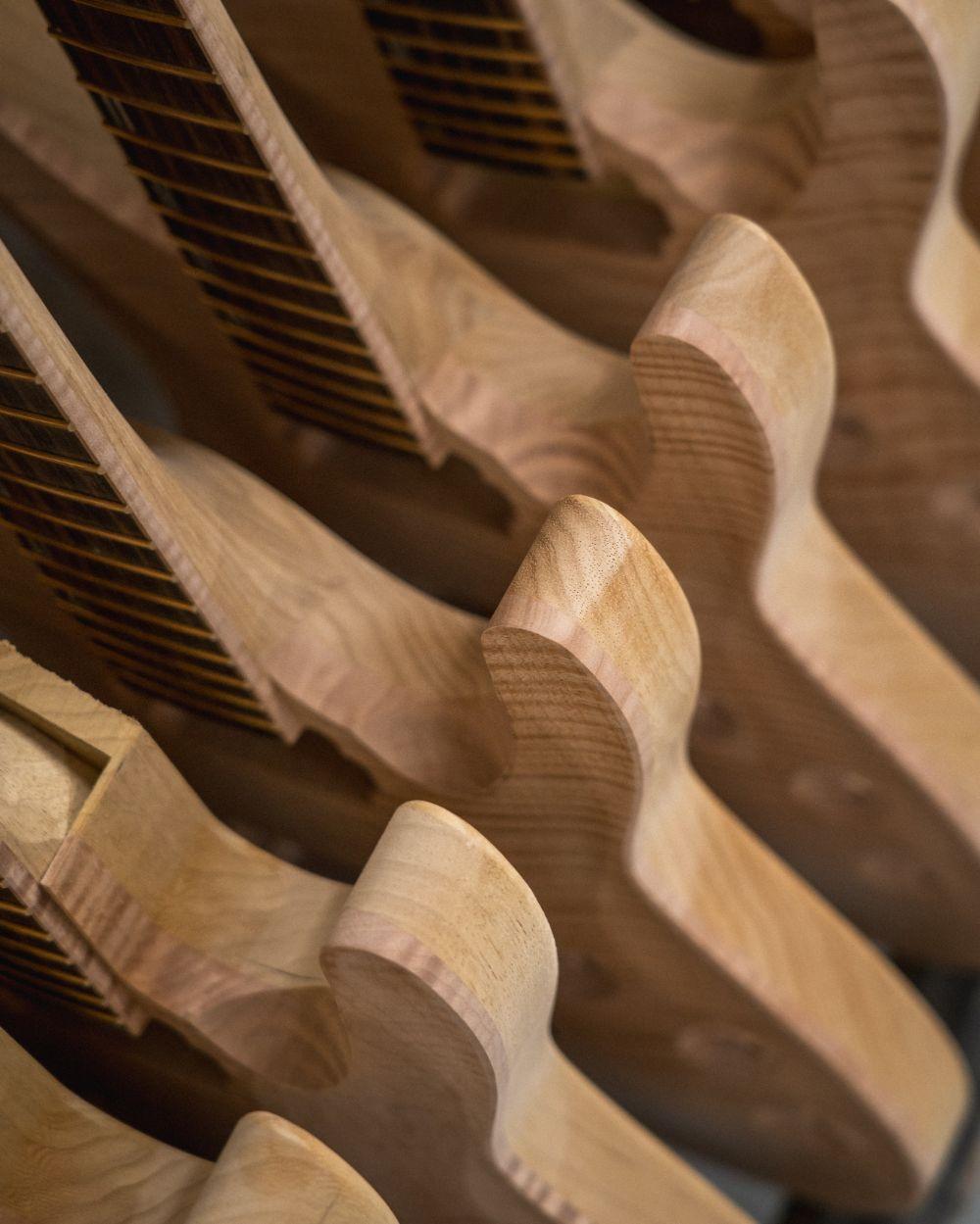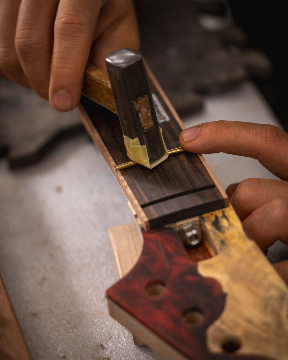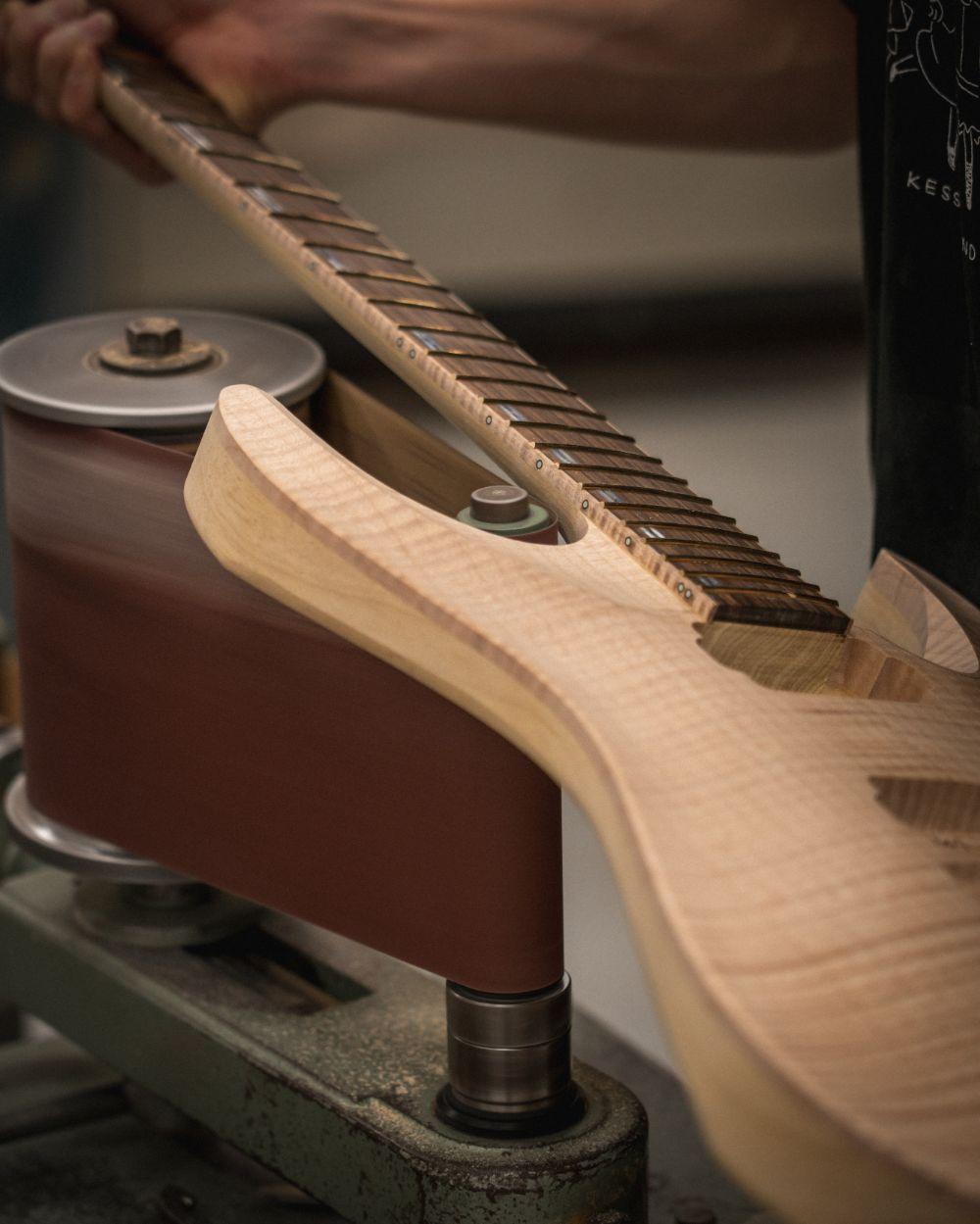 仕様も特別仕様ならではで、ボディバックにはローステッド・アッシュの1ピースを贅沢に、トップには個性的でワイルドなレジンで補填したバックアイ・バールをラミネート。ネックにはハードメイプル、ウォルナット、パドゥクをラミネートした7ピース材で、ボディにはセットネック方式でボディにジョイントされています。指板は縞模様が美しいマカッサル・エボニーで、アクセントにフレイムメイプルのバインディングが巻かれています。フレットにはJESCARのゴールドカラーのEVOが採用されています。ポジションマークは低音弦側に寄った白蝶貝とアバロン貝で構成されたダブルストライプ、サイドには蓄光素材のLuminlayが入れられています。