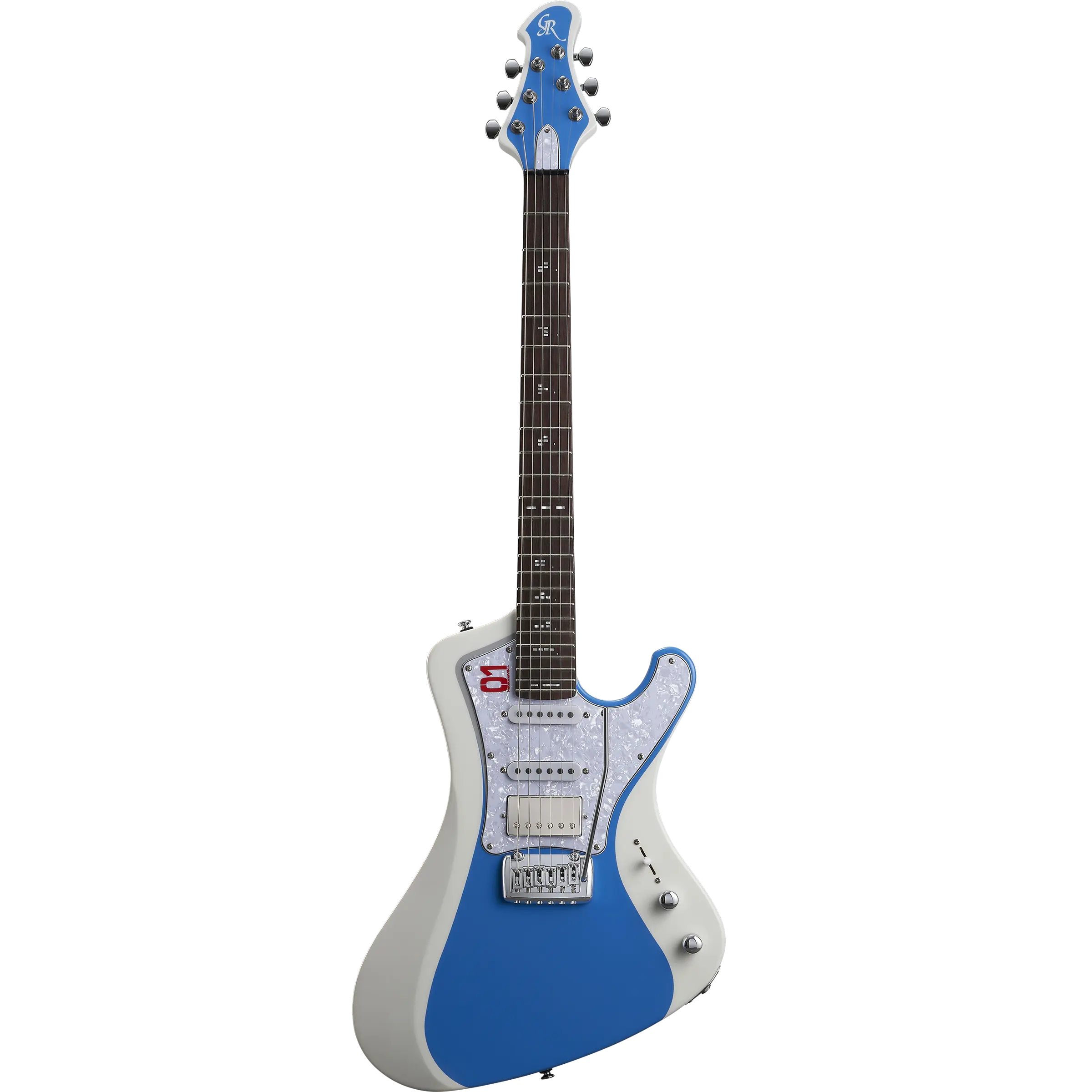 指板のトップ面に入れられているポジションマークは、初音ミクの袖に描かれている幾何学模様からインスパイアされたものです。
