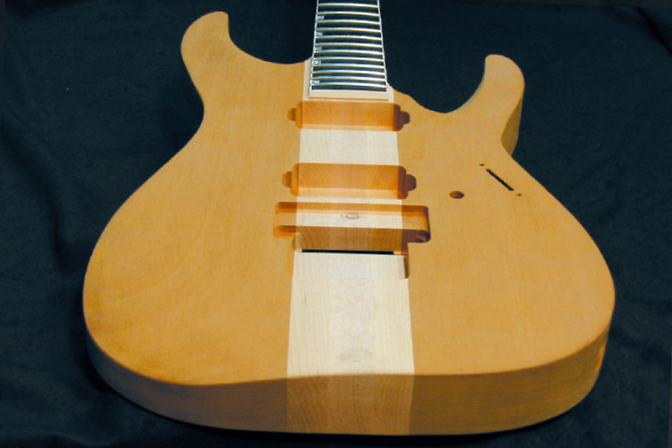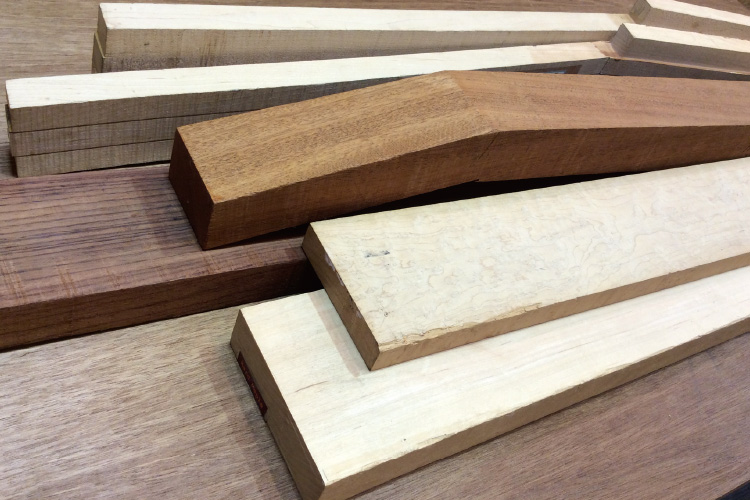 スルーネック構造の楽器でネック材の音質にプラスして、特性をつくる需要な部分です。左右の材の組み合わせを変えることで、微妙なトーンニュアンスを作ることもできます。ネック材とウイング材の上にさらにトップを貼る2Pトップ工法も対応可能です。