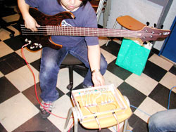 ![]() こちらはオリジナルプリアンプ試作中。トレブル、ミドル、ベースという極めてシンプルなコントロールで、5弦ベースの広い音域を網羅するというコンセプトで制作を始めました。これはライブなどの演奏中でも、直感的にトーンをエディットできるようにするためです。少ないコントロールで広い音域のツボを押さえるのは非常に困難なものでした。しかし粘った甲斐あってとても使い心地の良いプリアンプに仕上がりました。 |