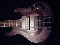 メイプル、ウォルナット、バドゥクによるラミネートネックの構造は抜群。更に指板の下には全体強度確保の2本のカーボンロッドが埋め込まれ、ジョイント部のネック起きを防止する補強カーボンが2本加えられた、計4本のカーボンロッドにより、5弦の張力に耐えている。 ナット幅は46ミリに設計され、4弦ベースから持ち替えたときの違和感を軽減している。グリップは薄めのUシェイプに削られ、特にハイポジションでの親指が裏にまわるプレイスタイルを楽にしている。 6点止めボルトオンの強固なジョイント部。多弦ベースは親指が裏にまわるため、ヒールカットは必要ないという判断のもと人間工学に基づいたジョイント形状を実現した。 |