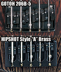 ブリッジにはGOTOH 206B-5(〜2005年まで)を採用。このブリッジは、コマをロックできるため、コマ鳴りは皆無。しかし、このブリッジがメーカにて廃番になってしまった為、現在ではHIPSHOT® Style "A" Brassを採用。コマのロックは出来ないが、それぞれのコマを囲むようなプレートデザインの為、コマ鳴りはほぼしない。レギュラースタイルの4弦ベースに準じた19ミリピッチを基本に好みで変更可能。 |