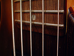 ブリッジでのテンションを確保したいが、それにはブリッジ弦高を高くする必要がある。そうするとボディトップと弦の隙間が大きすぎ、スラッププル時に指が入りすぎる。ピックガードはこのベースには似合わない。この問題を解決したのが特赦な形状のアーチドトップの底面にブリッジを配置する事だったのである。二次的な効果として、スラップ演奏時の右肘の安定にも一役買っている。 |