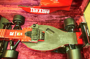 独断と偏見とその日の気分次第で過去に製作したGUITAR達を ご紹介していくことにしました。 記念すべき第1回目はESP F1 GUITARです。 このGUITARは日本中がF1ブームで盛り上がっていたころに製作した1本です。 最初はクルマ好きの桜井さんのためにF1 BASSを製作しました。 コンサート会場でリハーサルを始める前のステージ上で桜井さんにF1 BASSを渡し、 舞台下手で桜井さんがお喜びになられている時、ふと上手の王子を見て、 「F1 GUITARを作らなければ!!」と思い、大急ぎで製作されました。 BODYはF1のラジコン1/12モデルとほぼ同じ大きさになっています。 |