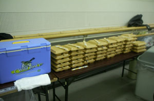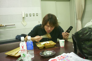オマケショット2。またまた登場の坂崎さん担当ローディ・平井。急なアクシデントにとても弱いという習性があります。しかし、弁当だけはしっかり食べなくてはいけない、というポリシーも持っています。画像は弁当を食べながらこの日の競馬のレース結果を携帯で確認している図です。ちなみに、本番約30分前!