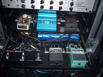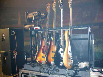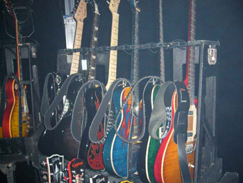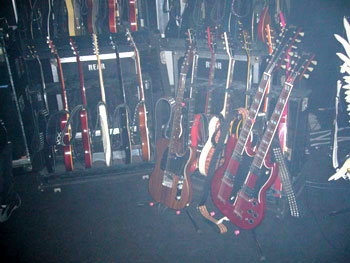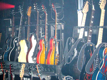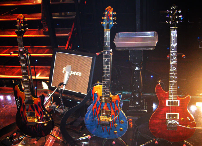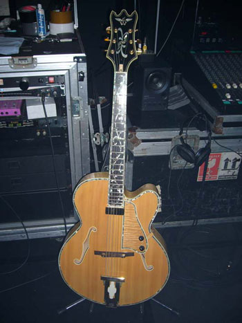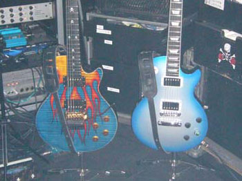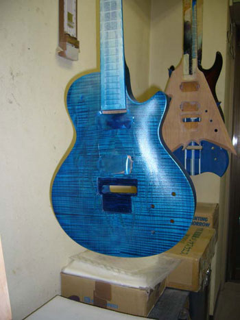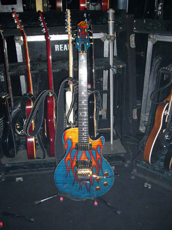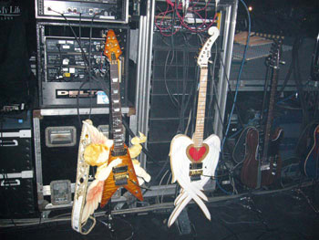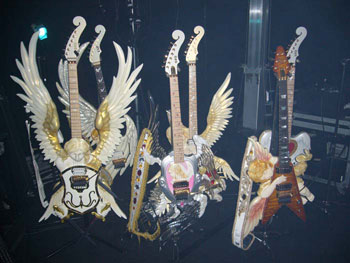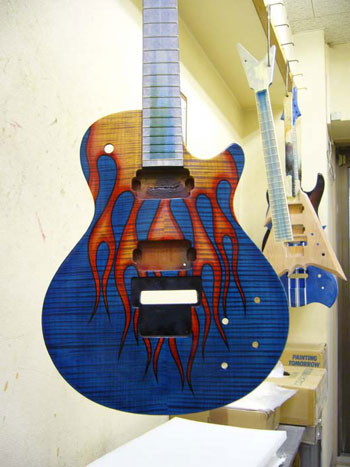 | すでに2008年になってしまいましたが、武道館公演の模様をお届けいたします。 秋ツアーが始ってからの私の仕事は武道館公演のために用意するギター2本の製作に追われる毎日でございました。 高見沢氏はLP、FVに続くギターサウンドを求めるべく、新たな境地へと進んでおります。 LP、FVにはない独自のオリジナルギターサウンドを創りだすのは並大抵の事ではありません。 それを模索する手始めに選ばれたのはESP POTBELLYという機種でした。 すでにこの機種をベースにソロツアー用で1本(上画像左)製作しておりましたが、あくまでもソロ活動のハードなサウンドを想定したものでした。 今度はTHE ALFEEとしてオールマイティーに使えるものをコンセプトに更に検討を重ねました。 そこで数年前にPOTBELLYをもとに私独自の考えを盛り込み製作したモデル(CRAFT HOUSE Original POTBELLY)を3本、 秋ツアーで使用して直接意見交換をし、更に武道館公演までの短い期間で妥協のないものを作り出すための模索をした結果、 LPタイプのシングルカッタウェイモデルを作ろうという事になりました。 余談ですが秋ツアー中に試していた3本のその後は、1本はそのまま高見沢コレクションの仲間入り(上画像右)、 もう1本(シースルーブルーでした)は返却後、LOUDNESSのレコーディングで高崎晃氏のもとへ貸出、 最後の1本(シースルーピンクサンバースト)は返却された後に売却という運命を辿りました。 こうして新たに誕生したのがPOTBELLY TYPE SINGLE CUTAWAY (上画像中央)なのです!!! 一見してPRS社のSCのようですが、これを凌駕しGibsonよりも図太いサウンド、更にフロイドローズの搭載という全てを呑み込んだ結果がこのギターなのです。 ネックグリップはこれまでの高見沢モデル史上で一番の極太ネックを採用、独自のボディシェイプそして材料の厚さ、 その全てが新たな高見沢ギターサウンドのために考えられたものなのです。 高見沢氏はこのギターの出来に満足され、予定通り無事に武道館デビューを果たす事ができました。 そしてこのモデルが2008年の高見沢ギターサウンドの中核のひとつになる事でしょう。 さて武道館用ギターのもう1本はサードプラネット社様よりオーダーをお受けしたオリジナルギターです。 こちらはギターデザインコンテストで選ばれた作品を実際に製作するというもので、 原作者様のデザインを出来る限り再現し、楽器としても十分に使えるのもを作る事が最大のテーマになります。 デザインを頂いた時にANGELギター同様の工程を踏まなければデザインの良さを引き出す事ができないだろうという考えで製作にあたりました。 結果的にはこのギターを弾く高見沢氏の意見も取り入れ、このデザインを更にステップアップさせたものが出来上がりました。 こちらも約束通り24日の武道館で登場し、大阪ファイナルでも使用されました。 2007年は本当にハードな製作をしてきた年でした。 2008年はさらにハードな年になる事でしょう。きっと・・・ |