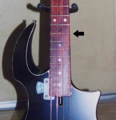 ![]() SLAVE-I完成当時の写真。1,2弦の13フレット以降がフレットレスになっているのが確認できる。 林曰く、作ったときも再度フレットを打ち直したときも苦しんだらしい。 |