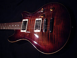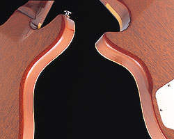 ●エレキギターのは楽器の中でも重い部類だ。長時間の演奏には体への負担も伴う。その負担が演奏に影響しては元も子もない。但し、演奏性を重視するばかりに音質が損なわれるのも考え物だ。そこで妥協点としてPOTBELLYでは、ボディ裏の体のあたる部分のRを大きくした。バックカットを付ければ話は簡単だったが、このギターには不向きであると判断した。 ●演奏性の良いダブルカッタウェイデザイン。やや小ぶりに見えるが、ブリッジを中心に幅を大きく取ることにより、弦振動を無駄なくボディに伝える設計となっている。 ●トップ材はPOTBELLYでフィギュアドメイプル。倍音成分を多く含みマイルドなトーンを生み出す。美しい木目も大きな特徴だ。POYBELLY STDではプレーンなハードメイプルを採用し、アタッキーできらびやかなトーンが魅力である。バック材はマホガニー。古くからメイプルとは抜群の相性の良さを誇る。 これら良材を楽器としてのボディに昇華させるのが、独特の深いアーチドトップ。ESPの職人技が最も光る部分でもある。POTBELLYの名前の由来であるこのふくよかなアーチドトップに受け止められた弦振動は増幅されてボディトップ全体に行き渡り、そしてボディ全体、ネックに伝わり、プレイヤーの左手にしっかりと感じられるはずだ。 |