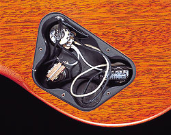 仕掛けなしの1ヴォリューム、1トーン、それにセレクタースイッチ。ポットにはUSA製CTSを採用し、トーンコントロールのキャパシターにはオイルコンデンサーを使用。コントロールキャビティーにはスイッチ、またはポットを増設する余地がある。 |