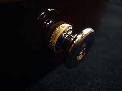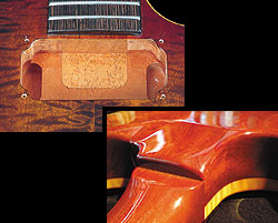 楽器は美しくありたい。その思いで手間のかかる生地着色を選んだ。ナチュラルバインディングでコントラストを持たせ、風格も申し分なしだ。 ノンロックのストラップピンながら、外れにくいものを採用。皮のクッションがボディへのフィットを増し、緩み防止にもなっている。不用意にギターを立てかけた時に与えるダメージも軽減される。 |