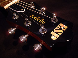 小ぶりなデザインのヘッドに高精度なクローズドキアのペグをバランス良く配置。トラスロッド調整部への容易なアクセスの確保とチューニングの狂いの原因になる弦の折れ曲がりを極力押さえた設計になっている。 ヘッド角は10度に設定されチューニングの安定と、サステインの向上を計っている。10~46ゲージの弦を張ったときのスムーズな弾き心地、音の粘りを体感してほしい。ヘッド裏のボリュートはヘッド折れと言う不慮の事故を防止すると共に、ヘッドの振動をタイトにし、このギターのサウンドキャラクターの一部を担っている。ナットは安定した音質を持つ牛骨を使用。 |