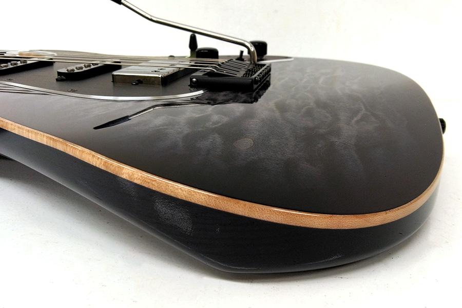 抜群の鳴りを誇る軽量なスワンプアッシュをボディバックに採用し、トップには現在では希少となった厳選キルテッド・メイプルを使用。エルボーカットに沿ってトップ材を曲げて接着するドロップトップ工法によってラミネートされており、美しい立体感と高級感を両立しています。さらに、エッジ部分にはナチュラルバインディングが施され、外観に一層の華やかさを加えています。