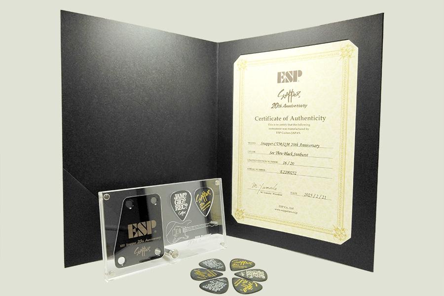 20周年モデルである事を証明する認定証を始め、SNAPPER 20th Anniversaryが書かれた非売品のスターカットプレートとスペシャルなピック2枚が収められた特製モノリス、そのモノリスにも収められているピック2種各3枚づつが付属します。