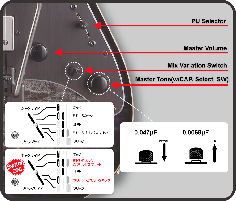 ミックスバリエーションスイッチを装備。このスイッチをONにする事で、ミックスポジション時で選択されるピックアップが「ネック+ミドル」から「ネック+ミドル+ブリッジ」、そして「ミドル+ブリッジ」から「ネック+ブリッジ」に変更されます。