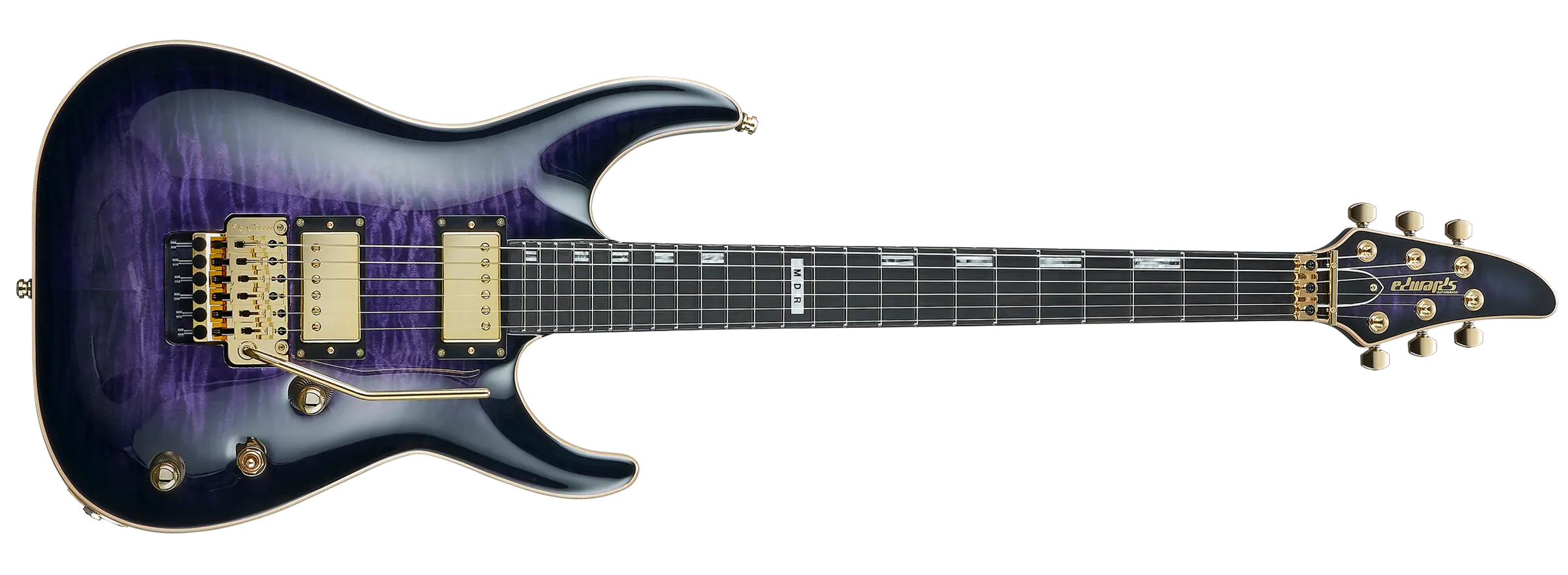 カラーバリエーションは、ESPモデルには華やかで存在感のあるグリッターストームバイオレットを、EDWARDSモデルには気品あふれるロイヤルアメジストサンバーストを採用しました。いずれのモデルもゴールドカラーのハードウェアで統一され、ステージ上での圧倒的な存在感を放ちます。
